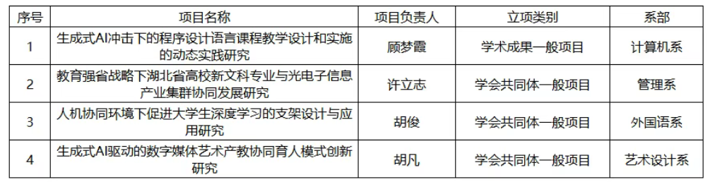 近日,湖北省高等教育学会公布了“2025年度湖北省高等教育学会教育科研项目”立项名单,我院成功获批4项课题,其中学术成果一般项目1项,学会共同体一般项目3项。立项数量居全省同类高校前列。具体立项名单如下: