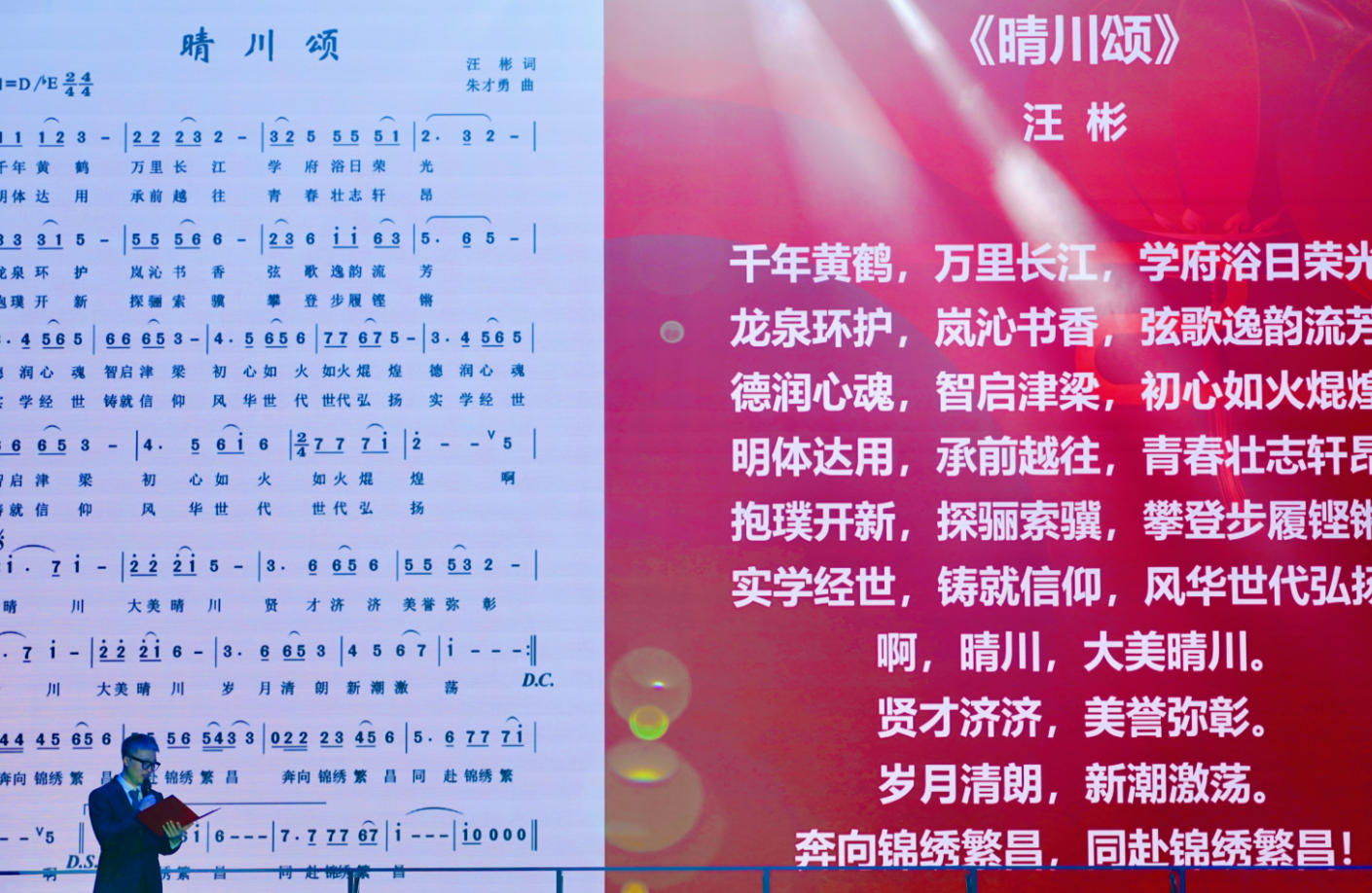 “千年黄鹤,万里长江,学府浴日荣光。龙泉环护,岚沁书香,弦歌逸韵流芳……”9月28日晚,武汉晴川学院体育馆内,青春律动,歌声如炬。在该校一年一度的“迎新生、庆国庆”金秋文艺晚会上,武汉晴川学院校歌《晴川颂》重磅发布。这首由该校董事长、校长汪彬教授执笔作词,著名作曲家朱才勇先生谱曲的校歌,以诗意的笔触与昂扬的旋律,深情诠释了学校的办学特色与时代使命,成为校园文化品牌建设的又一硕果。