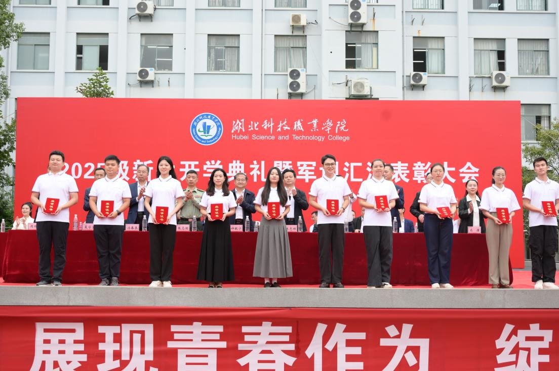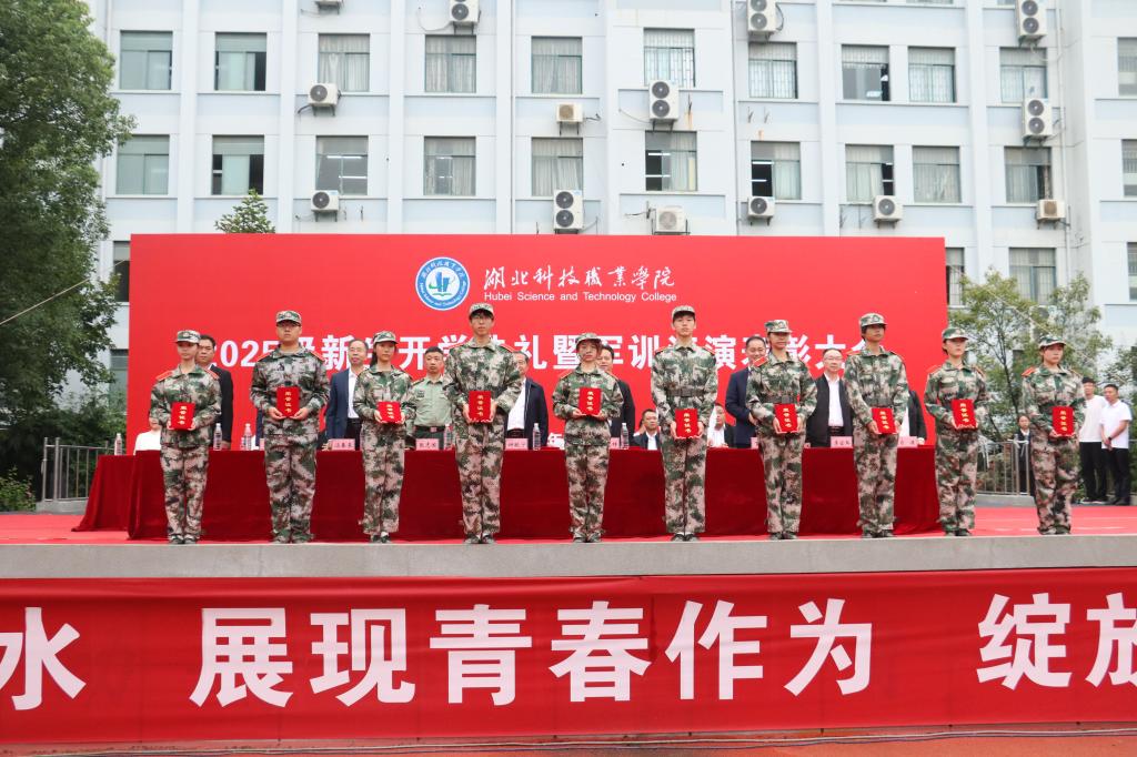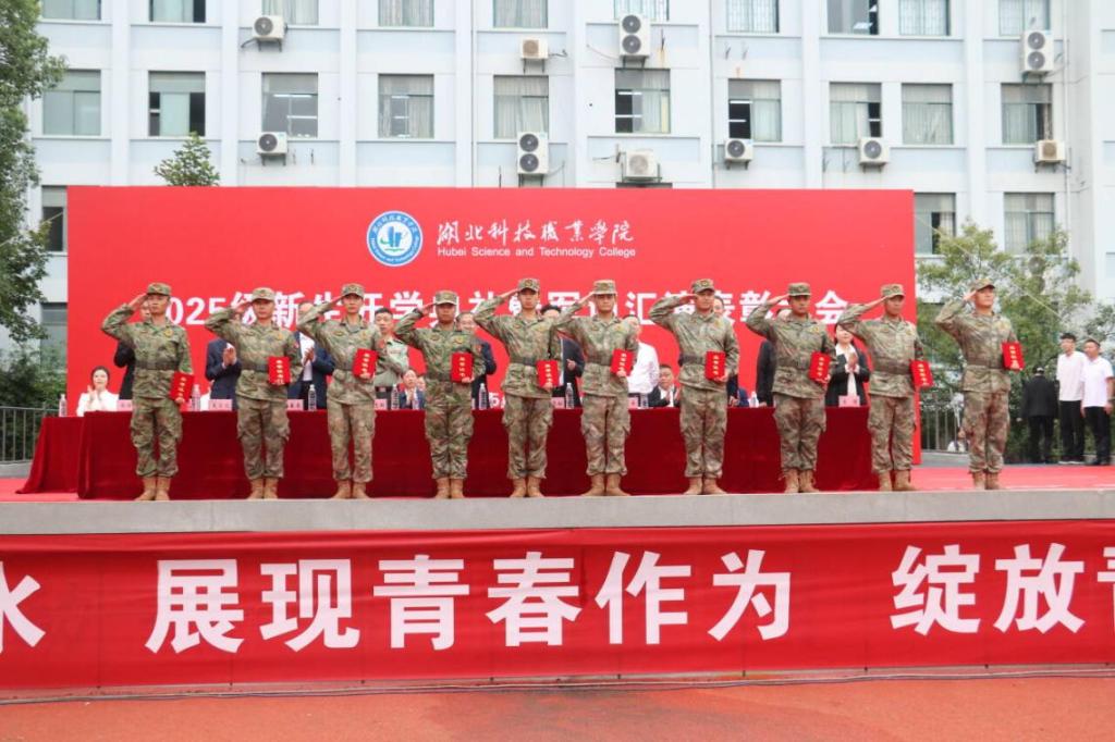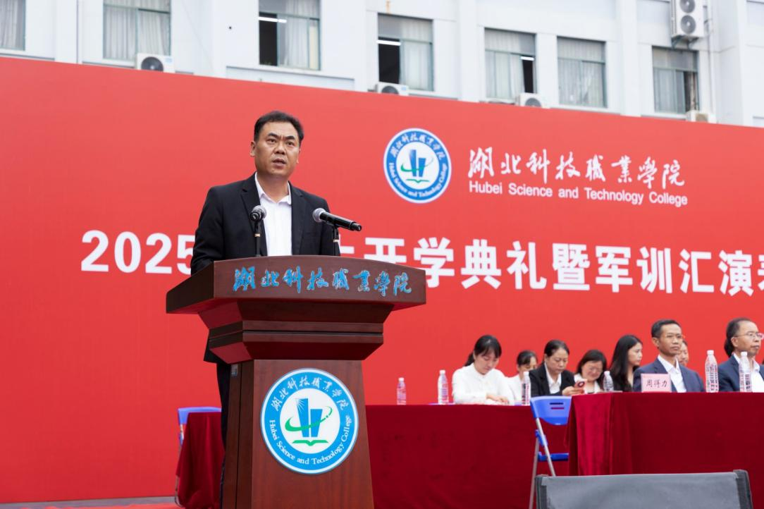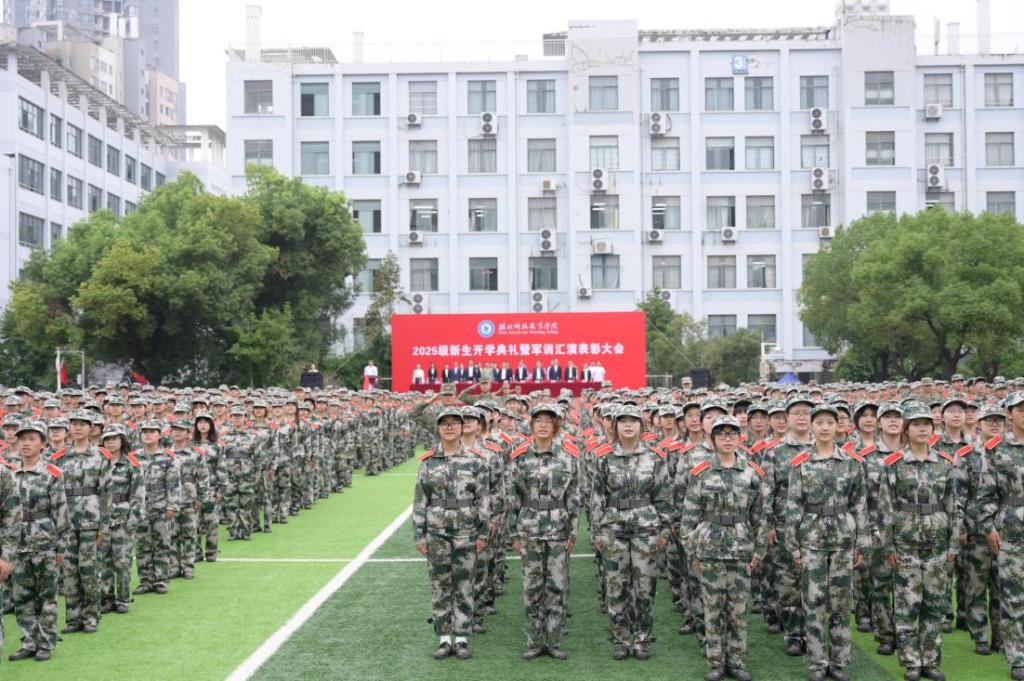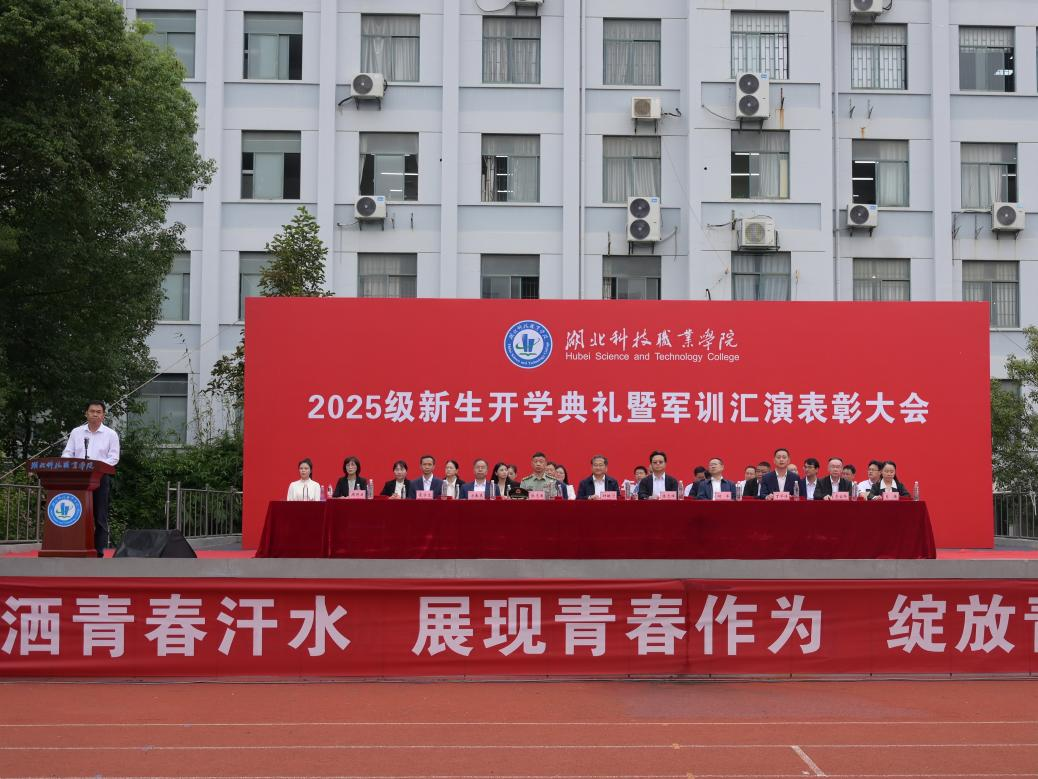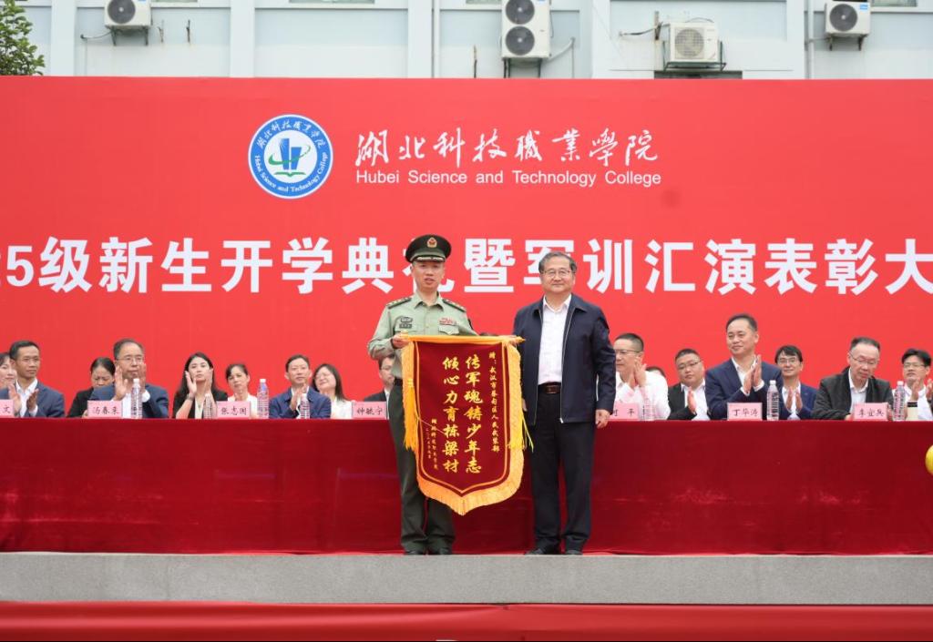 秋阳映芳华,旌旗展风采。9月26日上午,湖北科技职业学院在关山校区运动场隆重举行2025级新生开学典礼暨军训汇演表彰大会。全体校领导、承训部队代表、各学院党政负责人、相关职能部门负责人、全体新生辅导员及教师代表到场共同见证2025级新生经受军训洗礼后的飒爽英姿和开启大学生涯的崭新篇章。