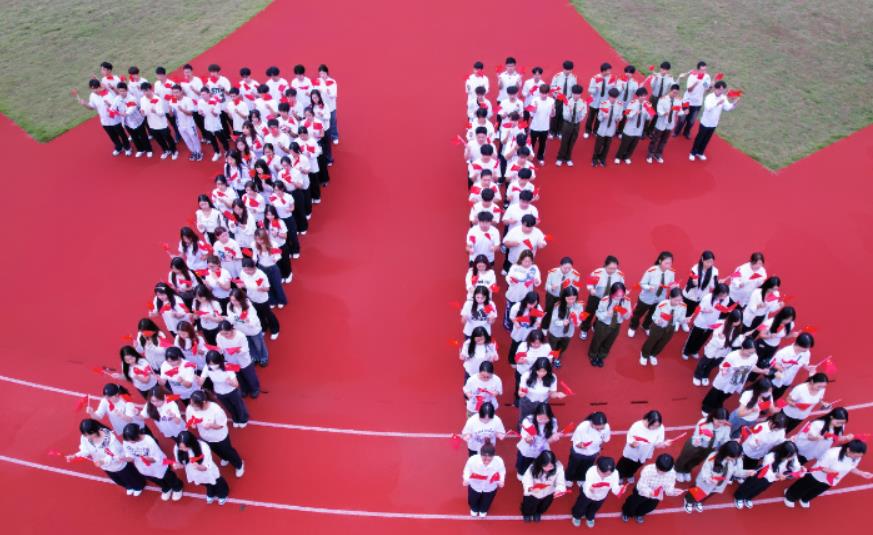 升旗仪式过后,全体学生用响亮的声音齐声欢呼:“祖国生日快乐,我爱你!”并摆出数字“76”的字样,表达对祖国母亲深深的热爱。
