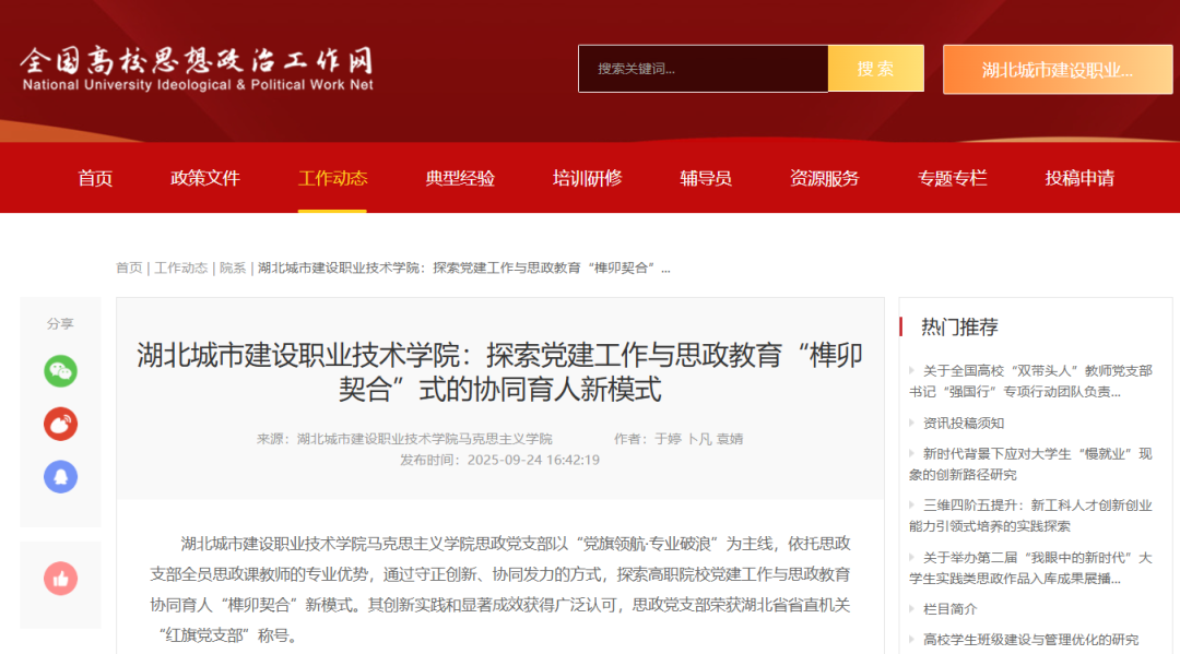近日,湖北城市建设职业技术学院马克思主义学院思政党支部探索的党建工作与思政教育“榫卯契合”式协同育人模式,作为典型案例在全国高校思想政治网发表,标志着该校党建与思政工作融合创新实践获得国家级认可。
