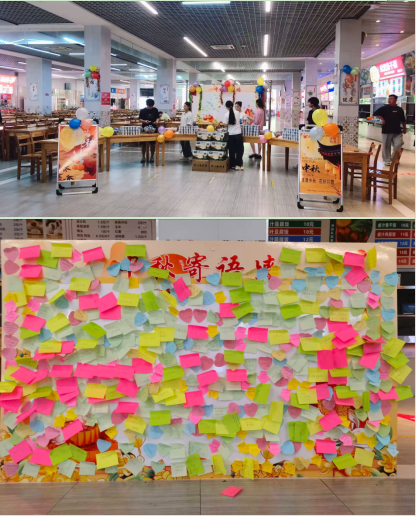 中午就餐时段,新老食堂一楼专门设置了月饼发放点。师生员工有序领取,现场洋溢着浓浓的节日氛围。许多同学表示,虽然未能回家与亲人团聚,但在学校同样感受到了家的温暖。此外,食堂还推出了“中秋寄语墙”,不少同学写下对家人、朋友和老师的祝福,字里行间流露着真挚的情感与团圆的喜悦。