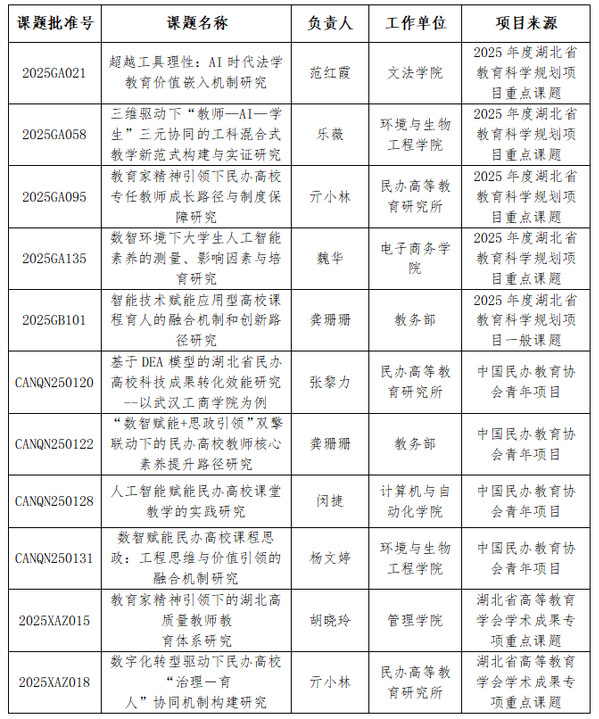 其中,在2025年度湖北省教育科学规划课题立项中,该校共有5项课题获准立项,包括4项重点项目和1项一般项目,立项数量居湖北省同类高校前列。同时,该校还成功获批中国民办教育协会规划青年课题4项,湖北省高等教育学会教育科研重点项目2项,具体立项信息如下: