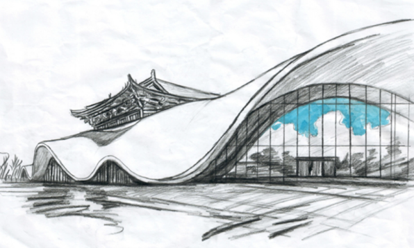 绘画创作组的同学们以笔为媒、以景为卷,用细腻笔触捕捉时代气象,让思想深度在色彩与线条间自然流淌。阙慧同学的水彩写生《琴台馆外观》,精准捕捉到建筑线条的利落与自然环境的温润——玻璃幕墙映照着蓝天白云,绿植环绕衬托建筑恢宏,生动呈现出现代公共文化设施与自然和谐共生的美好图景,尽显城市文化空间的大气度。陈文茜同学的作品《蓝染工艺——文化自信的传承创新》,则将视角投向非遗文化的当代活化,画面中,蓝染织物的靛蓝底色配以凤鸟纹、云雷纹等荆楚元素,设计现代纺织用品,既展现了传统工艺的素雅之美,又凸显了非遗“现代生活”的创新路径,深刻诠释了“推动中华优秀传统文化创造性转化、创新性发展”的实践意义。左华华同学的《曲幕映天:琴台美术馆的时空褶皱诗》更具艺术思辨性,她以极具想象力的构图打破空间局限,让美术馆的曲面穹顶与天空的流云形成“时空对话”,仿佛将建筑的静态之美转化为流动的诗意,尽显新时代青年设计师独特的艺术视角与创新思维。