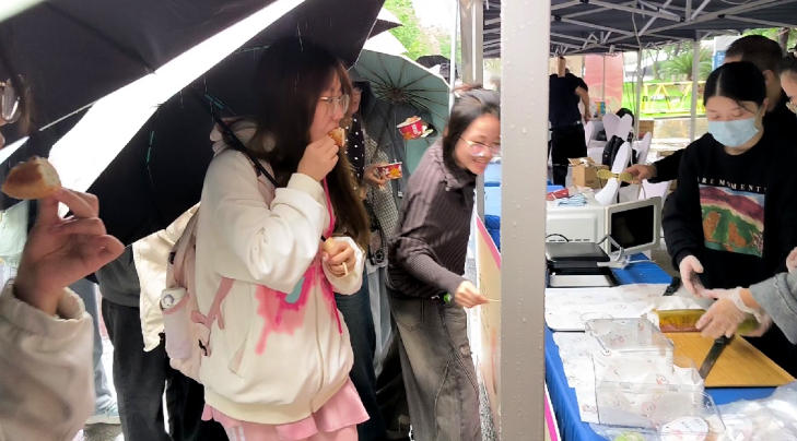 “零添加”“好吃不胖”“富含不饱和脂肪酸和优质蛋白”“学校团队研制”……在校企联名产品品鉴区,蔡林记热干面、播鲜生面包、益海嘉里抹茶慕斯蛋糕等展位前,工作人员热情介绍产品特色,吸引同学们驻足品尝。尽管天空飘着细雨,微带凉意,却丝毫未减同学们对美食的热情。“味道很清新爽口”“感觉真的没有什么添加”“好吃,特别好吃,停不下来”“没想到背后有这么多科技活儿”“厉害了,我的轻工大”现场好评如潮,同学们纷纷打出高分。
