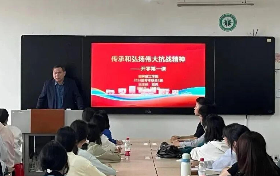 为落实立德树人根本任务,推动学校思想政治工作高质量发展,10月13日,湖北生态工程职业技术学院党委书记赵虎作为班主任,为2025级园林技术专本联合班以《传承和弘扬伟大抗战精神》为题讲授了开学第一课。