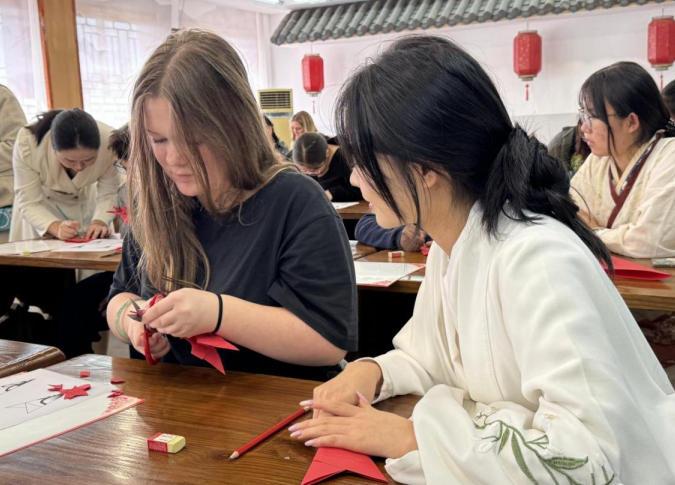 作为学院“筑家”社区文化育人的核心载体,国学教育中心今日化身跨文化思政课堂。剪纸体验区里,中外学生协作完成的剪纸作品,成为文明互鉴的鲜活见证;书法体验台旁,访问团学生在笔墨交融中感受文字背后的文化认同。