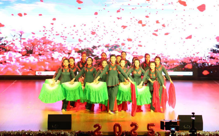 晚会节目形式多样,精彩纷呈。既有开场舞《奔跑的青春》瞬间点燃全场的活力,也有群舞《映山红》用优美舞姿演绎的红色深情;既有相声《返校》以妙语连珠带来的满堂欢笑,也有情景朗诵《怒放的青春》用慷慨激昂抒发的青年壮志。乐队一曲《海阔天空》唱响追梦的摇滚力量,走秀《溯光》则步态生辉,尽显礼仪风范。从深情款款的《落叶归根》《友情岁月》,到活力四射的舞蹈串烧,再到最终引爆全场的歌伴舞《我和我的祖国》,整场晚会高潮迭起,掌声不断。