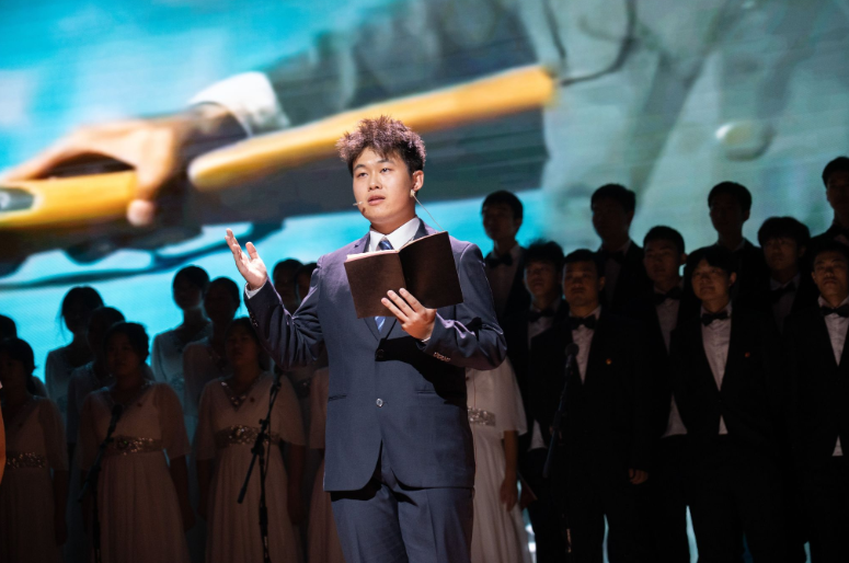 第一篇章“祖国颂·壮歌”,在青年讲师团成员卢大千深情讲述中国人民抗战的悲壮历程与不朽功勋后,合唱《保卫黄河》雄浑激昂,展现了中华民族不屈不挠的伟大抗战精神。