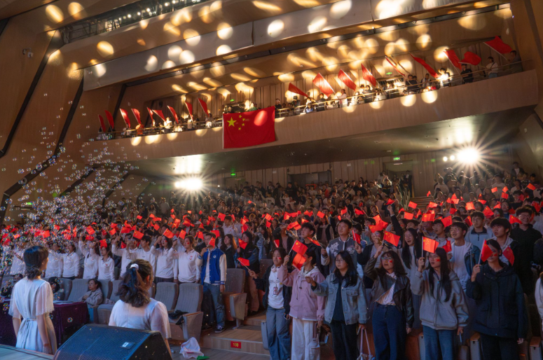 团课尾声,青年讲师团成员共同发出号召,激励全体师生继承先辈遗志,以青春之我、奋斗之我,为实现中华民族伟大复兴的中国梦贡献智慧与力量。现场千余名师生挥动旗帜共同高唱《我爱你中国》,发出心底最澎湃的告白,铿锵的誓言在会场久久回荡,也将音乐团课推向高潮。