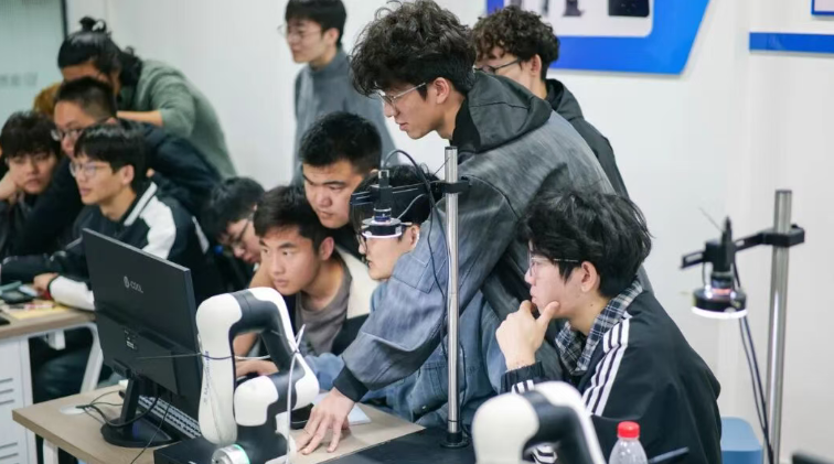 “成功了!”当机械臂终于按照自己设定的路径完美运行后,一位同学忍不住欢呼起来。10月17日的机器人基础实训可谓本次实习的一大亮点,在学习了基本编程原理后,他们亲手在实训平台上操作机械臂,编写指令,看着机器人精准地完成关节运动、直线轨迹描绘甚至复杂的圆弧动作。这种从代码到物理世界运动的转化,带来了无与伦比的成就感。