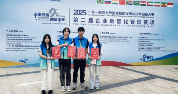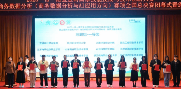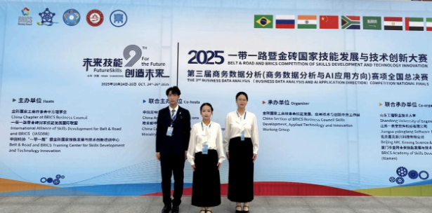 10月25日至26日,在2025一带一路暨金砖国家技能发展与技术创新大赛中,武汉船舶职业技术学院商务贸易学院学子表现卓越,再创佳绩!由张子菡、朱颖、梁清扬组成的代表队,在“商务数据分析与AI应用”方向赛项中勇夺全国一等奖;姜澳杰、欧阳宇航、周梦星组成的代表队在“企业数智化管理”赛项中荣获全国二等奖!同时,李雨竹、仲凯老师获得优秀指导教师称号,学校获得优秀组织奖。