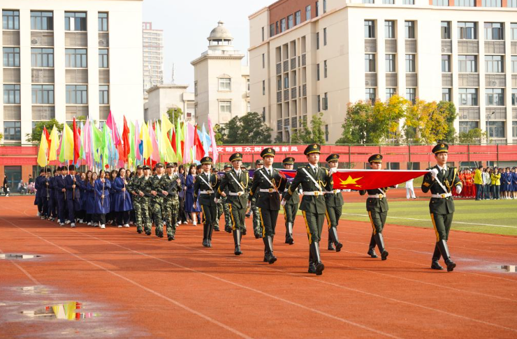 上午8时40分,在《义勇军进行曲》的激昂旋律中,国旗护卫队迈着铿锵有力的步伐,护卫着五星红旗和校旗庄严入场。全场师生肃立,行注目礼,在雄壮的国歌声中注视着国旗缓缓升起,开幕式正式拉开序幕。