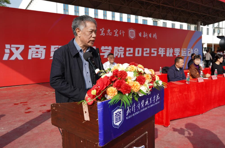 表演环节结束后,武汉商贸职业学院党委书记丁振国致开幕辞。他首先代表学校向筹备运动会的工作人员和参赛运动员表示感谢,他强调体育是落实立德树人根本任务的重要载体,在强健体魄、锤炼意志、凝聚力量等方面发挥着不可替代的作用。他肯定了我校运动员在各级赛事中取得的优异成绩,希望全体运动员发扬奥林匹克精神,赛出风格、赛出水平,并预祝本届运动会圆满成功。