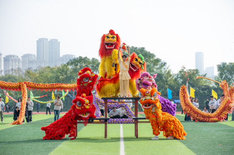 10月31日,在武汉工商学院第十九届田径运动会开幕式上,300余名学生共同演绎了一场气势恢宏的舞龙舞狮表演。彩龙翻腾起舞,雄狮矫健腾跃,整齐有力的动作配合铿锵的锣鼓节奏,展现出中华优秀传统文化的独特魅力,场面蔚为壮观。
