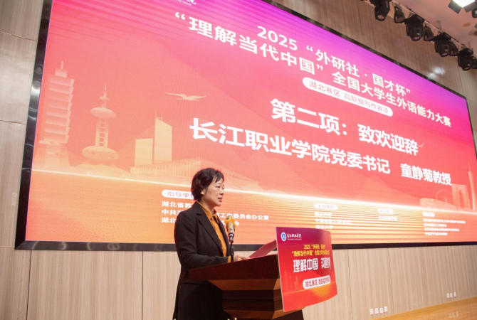 开幕式上,长江职业学院党委书记童静菊致欢迎辞,热情欢迎各方领导、嘉宾、评委及参赛师生,介绍了学校近年来在外语教育和人才培养方面的成果,并特别分享了多名从“外研社·国才杯”赛事中成长起来的优秀学子案例。她表示,大赛在推动外语教学创新、服务国家国际传播能力建设方面有着重要意义,是“锤炼文字艺术、启迪智慧思想”的重要平台,并寄语参赛选手“以笔为舟,在文字的江河中扬帆致远”。