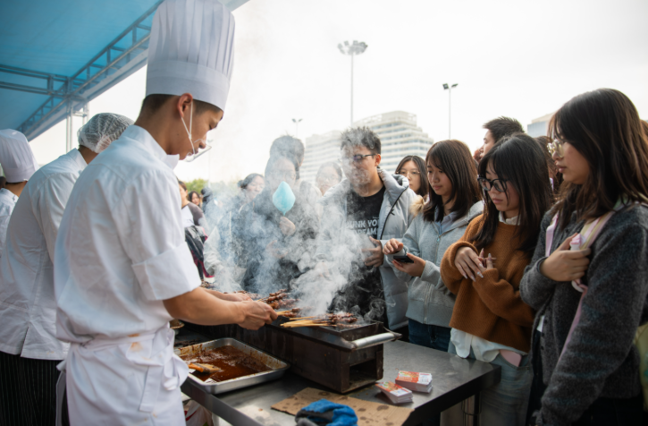 本届校园美食文化节在副校长向悦宣布开幕声中正式拉开序幕,参加开幕仪式的嘉宾们齐切蛋糕,分享给现场热情高涨的师生们,师生共享美食文化节大蛋糕和烤全羊,热闹非凡,各食堂展位依次排开,摊位前挤满品尝美食的师生。食堂师傅们各展技艺,为师生呈现一场风味美食盛宴。川、湘、粤、苏、浙、闽、鲁、徽、楚等风味美食,百余种具有地方特色的菜肴和小吃,让人既饱口福又饱眼福。民间传承匠师现场制作画糖人、棉花糖、冰糖葫芦等中华传统美食,帮助师生找寻记忆中的美味。