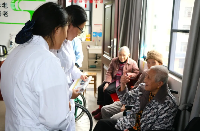 在余长畈村中心大广场,绿康社、南丁格尔社的大学生志愿者们,现场为老人们进行养老护理、老年养生保健指导,并进行一对一的推拿按摩和康复保健讲解,老年眼视光简易筛查和用眼卫生科普,让老人们感受到贴心关怀。