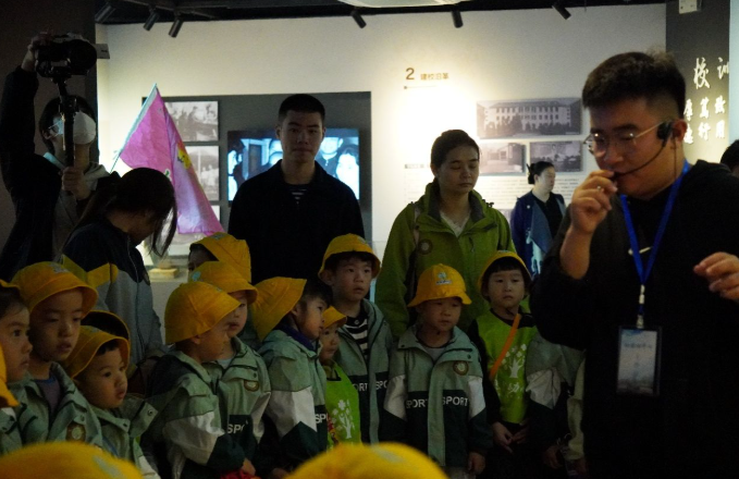 第一站来到了舰船与航海博物馆。各类舰船模型、航海仪器、历史照片映入眼帘,瞬间点燃了孩子们的好奇心。融媒体中心讲解员李宗霖同学,从古代木船讲到现代军舰,从古代四大发明指南针讲到现代先进导航设备,孩子们听得津津有味,不时举手提问:“这艘船能开去大海吗?”“军舰上有大炮吗?”一旁的志愿者们耐心解答,让他们在亲身体验中感受航海技术的神奇与舰船文化的深厚底蕴。在遇到后排小朋友们看不到的展品时,军士学院志愿者还将小朋友抱起来让其看到讲解的展品。