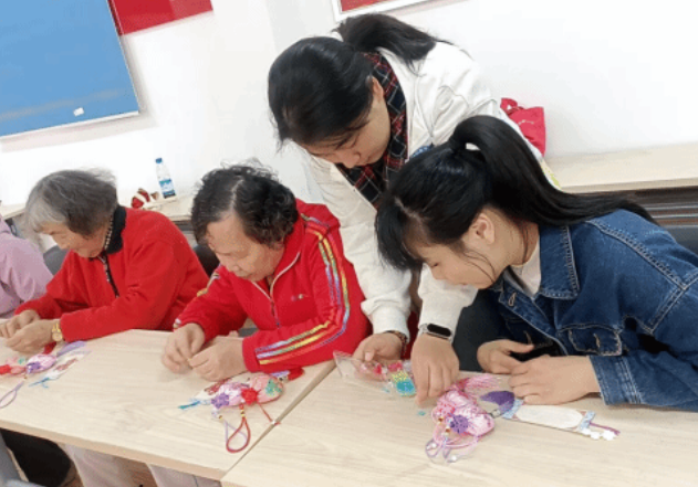 为让老人们亲身感受传统文化的魅力,活动特别设置了“制作非遗螺钿”环节。在志愿者的“手把手”指导下,老人们认真学习螺钿镶嵌的技巧,将一片片精美的贝壳细心贴在漆器上,创作出独一无二的非遗作品。此外,志愿者们还向每位参与活动的老人赠送了精心准备的艾草香囊,淡淡的草药清香寄托着美好祝福。