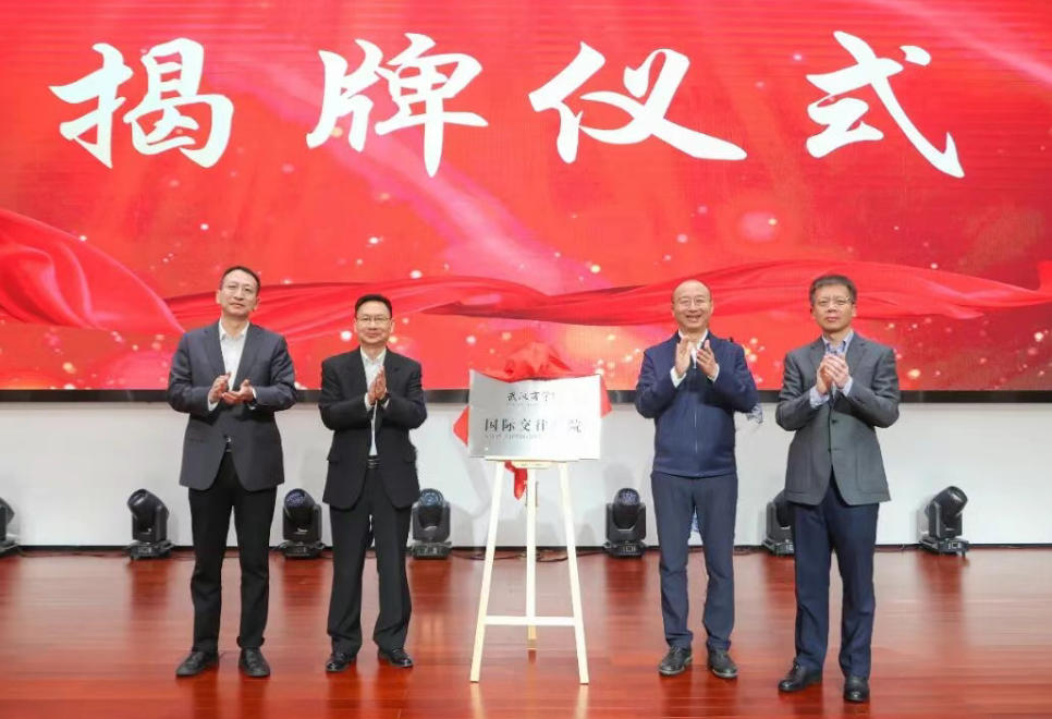 中共武汉市委外事工作委员会办公室主任喻峰、武汉长江国际贸易集团有限公司董事长丁震,学校党委书记孟武康、校长彭瑜共同为国际交往学院揭牌。