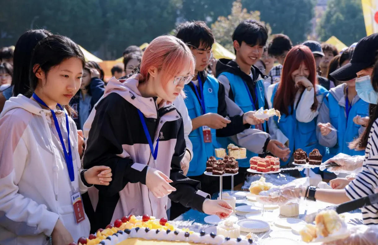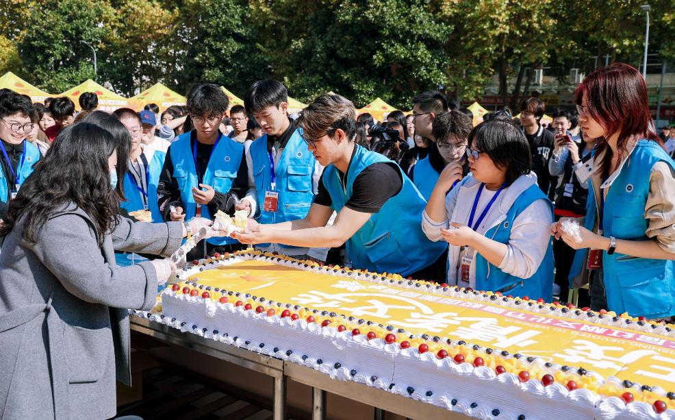 为庆祝校园美食展的开幕、欢迎各位师生和游客的到来,学校为大家制作了3.6米长的蛋糕。制作蛋糕的过程吸引了无数人员的驻足,活动现场热闹非凡。伴随着欢快的音乐与欢呼声,由各位领导切下“第一刀”,相关工作人员分享蛋糕给围观游客,一同庆祝这份美好。