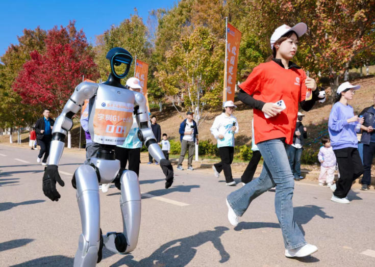 最特别的是,领跑队伍里不仅有活力满满的高云龙等八位学生代表,还有四位特殊的“运动员”——人形机器人和银灰色机器狗。金属的冷硬与红枫的暖艳撞个满怀,科技的灵动与秋景的静谧相互映衬,不仅成了跑道上最吸睛的风景,更把“传承古智、科创未来”的深意,融进了这场秋日奔跑里,让每一个跟跑的人,都真切感受到传统与现代碰撞的力量。