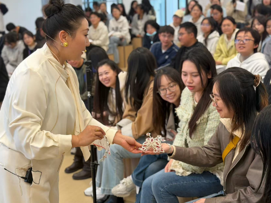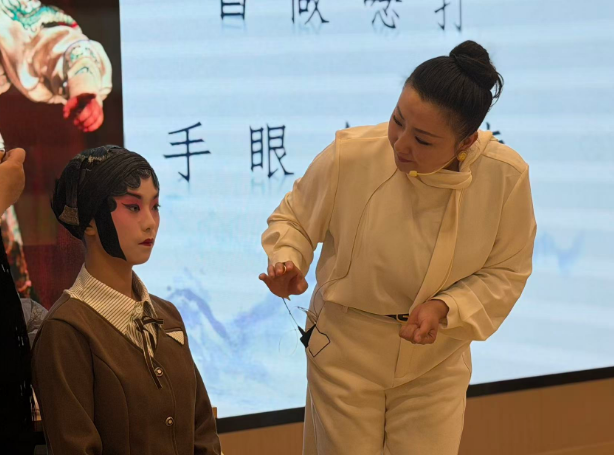 为让师生深入理解汉剧表演精髓,王荔以穆桂英、柴郡主等经典角色为例,对比解析不同行当在“唱念做打”与“手眼身法步”上的微妙区别。她还现场展示水袖技法,一抖一收间,喜怒哀乐跃然袖端,赢得掌声不断。随后,两位已完成妆容装扮的学生,在王荔与彭冲的指导下“现学现演”,尝试基础台步与水袖动作。短短几分钟的体验,已让同学们由衷感叹“台上一分钟,台下十年功”的不易。