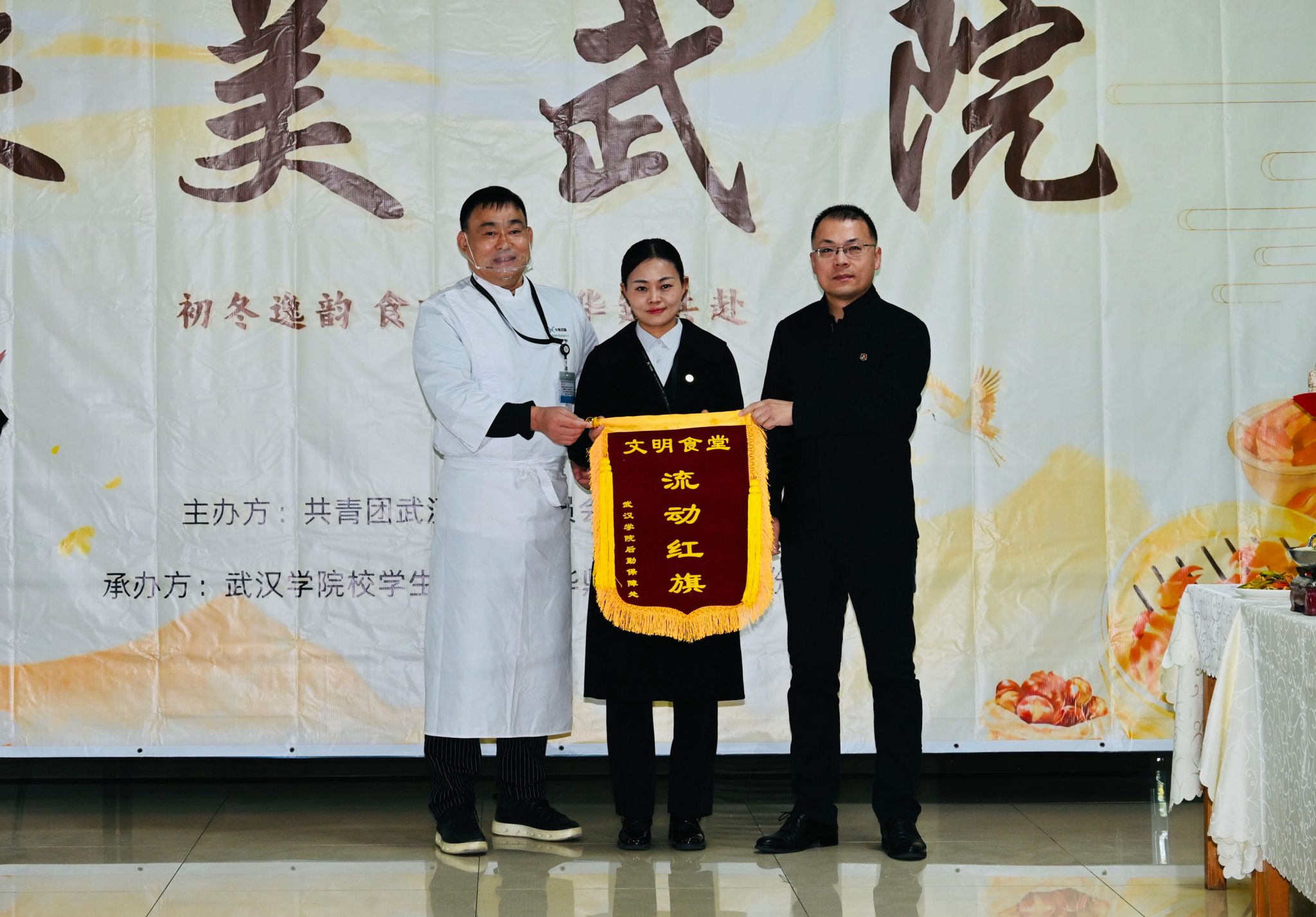 颁奖典礼环节,胡达丰为荣获2025年度“文明食堂”称号的楚园食堂颁发锦旗,后勤保障处处长董运祥为获奖档口代表授予“文明档口”锦旗。