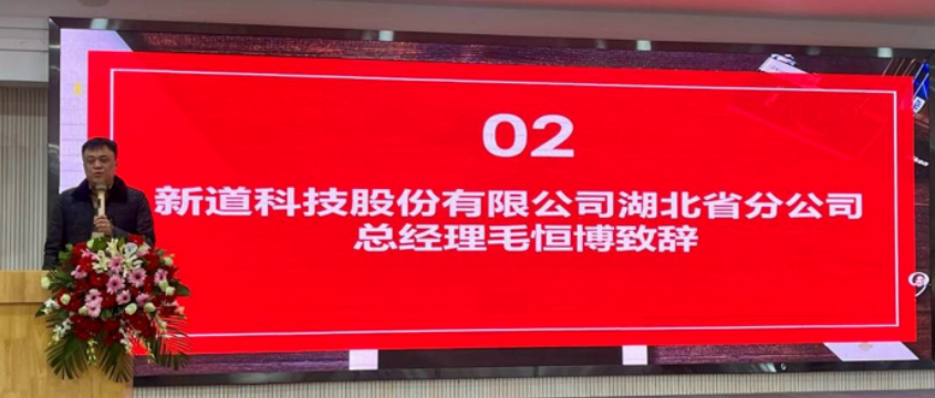 大会伊始,湖北分公司总经理毛恒博代表企业致辞。在致辞时介绍了新道科技的发展历程,向老师同学们汇报了新道科技与武汉东湖学院校企合作历程及协同育人的成果,并表达了对获奖同学的衷心祝贺和对未获得奖学金同学的勉励。