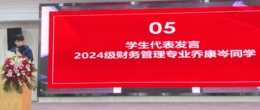 2024级财务管理专业学生乔康岑作为获奖代表发言。他分享了自己在专业学习与实践探索中的经验感悟,向学校提供的优质教育资源、企业搭建的实践平台及师长和同窗的支持帮助表达诚挚感谢。乔康岑表示,此次获奖既是荣誉更是责任,未来将以更高标准要求自己,在学业上精益求精,努力成长为可堪大用的智能财经人才。