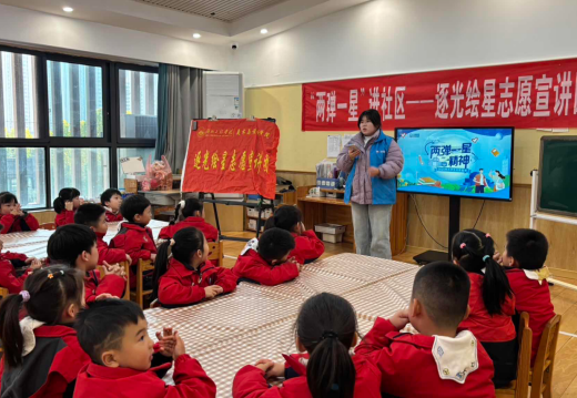 11月20日下午,蓝迪中都幼儿园大一班的教室里充满欢声笑语。湖北工程学院美术与设计学院逐光绘星宣讲团的7名志愿者俯下身姿,与孩子们平视交流,用故事和画笔开启了一场别开生面的“两弹一星”精神启蒙课。“看,这是火箭飞向太空的动画!”志愿者们精心准备的童趣动画片立刻吸引了孩子们的目光。他们将复杂的科学知识转化为生动故事,让孩子们在聆听中感受老一辈科学家的奋斗精神。