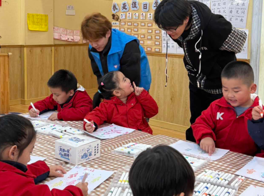 “我的火箭要飞得最高!”五岁的萌萌骄傲地展示着她的画作。在志愿者们的耐心指导下,孩子们认真勾勒轮廓,细心涂抹颜色,教室里只听见画笔在纸上沙沙作响。有的画了彩虹颜色的火箭,有的在火箭周围画满了星星,还有的把自己的笑脸画进了航天舱。这些充满童趣的作品,展现了孩子们对太空的无限遐想。完成创作后,志愿者们为每幅作品都盖上了特制的“两弹一星”纪念印章。这个小小的仪式感,让孩子们的成就感油然而生。大一班班主任张老师感慨:“这种寓教于乐的方式,比单纯说教更有感染力。”