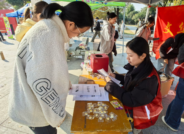 除了脑力比拼外,现场还设置了丰富多样的体验项目。各学部青年志愿者协会精心设计的趣味游戏兼具娱乐性与公益性,参与者成功挑战即可兑换文创等纪念奖品。汉服社展位将传统文化与公益理念巧妙融合,身着传统服饰的志愿者现场讲解非遗知识,让公益氛围浸润文化韵味。