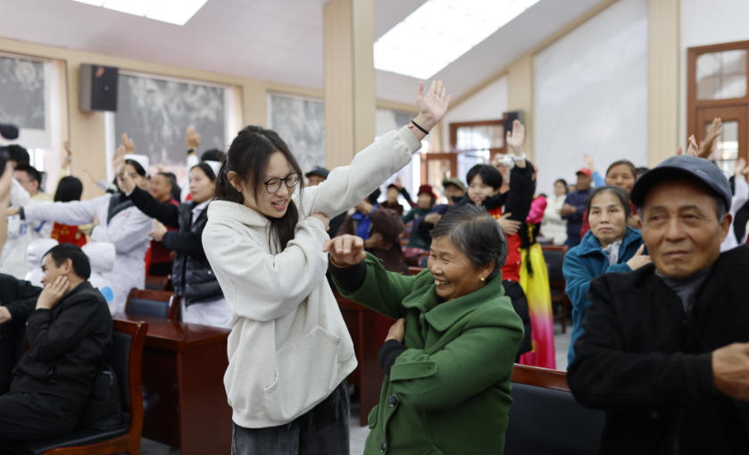 在弘扬红色文化的同时,活动更注重以专业所长服务乡村民生。在“传承中医智慧,亲睦乡里情深”环节,护理学院师生将课堂搬到村头,现场教学“穴位拍拍操”。同学们化身“健康小使者”,耐心细致地带领村民拍打穴位、讲解养生知识。现场欢声笑语,掌声与拍打声此起彼伏,不仅有效普及了简单实用的保健方法,更在轻松愉快的互动中深化了学子与村民的情感联结,生动诠释了“亲睦乡里”的活动内涵。