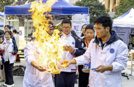 “科普集市游园探索之旅”活动正式开启。一系列集视觉冲击力与知识性于一体的特色科学实验轮番上演。在趣味拔河挑战中,学生们在力量与技巧的对决中感受乐趣,了解空气负压与摩擦力的科学知识;“火焰掌”互动体验区里,众人目睹火焰在掌心舞动的奇迹,在震撼的视觉冲击中直观领略到洗洁精水包裹丁烷气点燃、水吸热保护手部的独特原理;液氮遇热水瞬间,在气压推力下直冲云霄,让师生们直观感受气体膨胀的科学原理。师生乐于科学探索的种子在红枫漫染的校园里生根发芽,更让这场融合了趣味与干货的科普之旅成为红枫文化节中一道兼具知识与实践的风景。