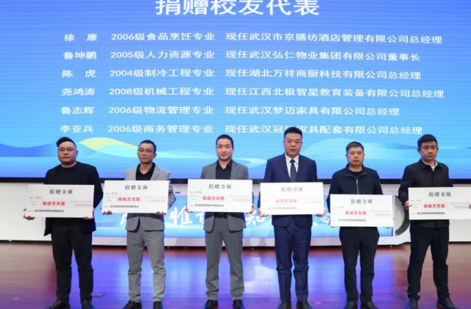 校友的深情厚谊是学校发展的不竭动力。在大会上,举行了武汉商学院教育发展基金会发起人认捐仪式。2006级食品烹饪专业徐康、2005级人力资源专业鲁坤鹏、2004级制冷工程专业陈虎、2008级机械工程专业尧鸿涛、2006级物流管理专业鲁志辉、2006级商务管理专业李亚兵六位校友代表上台认捐,以实际行动反哺母校。