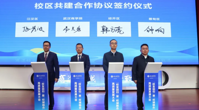 党委委员、副校长易先勇代表武汉商学院,与武汉经开区、蔡甸区、江汉区代表签署了校区共建合作协议。