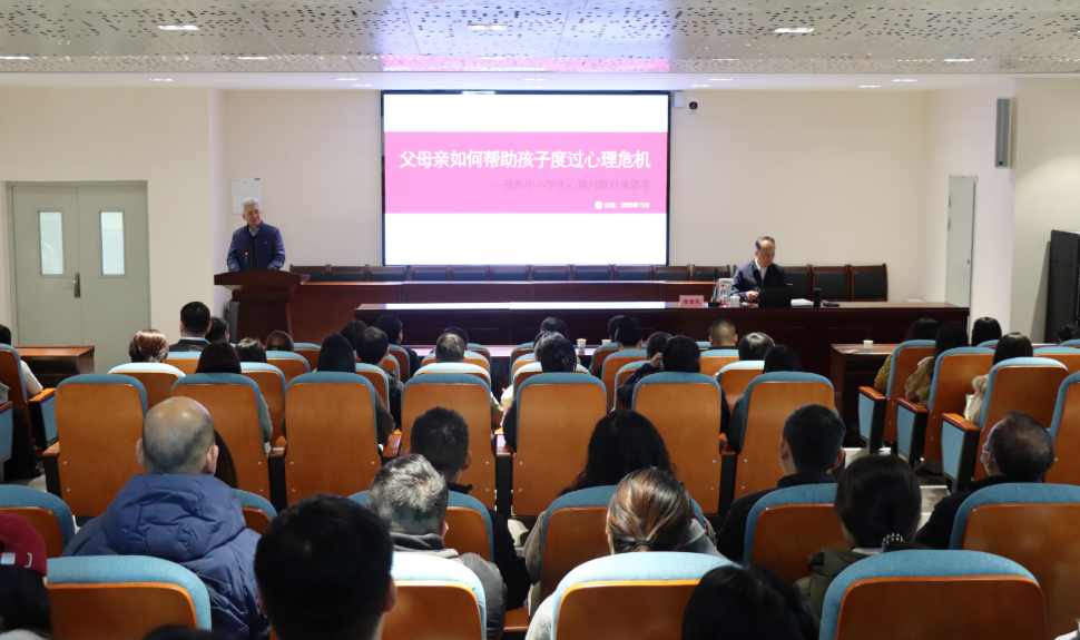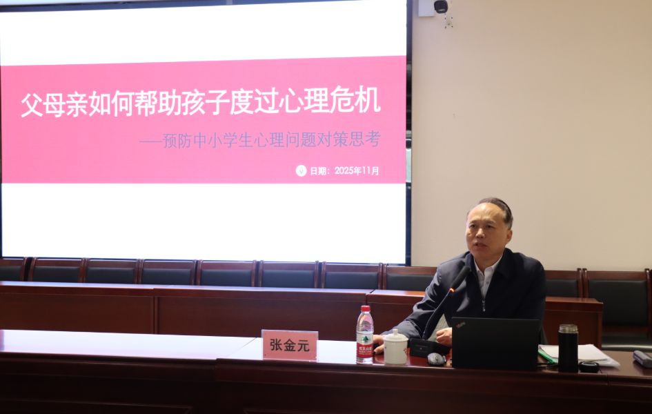 11月20日,湖北省生涯教育研究会会长张金元受邀在武汉外语外事职业学院图书馆报告厅开展了一场题为《父母亲如何帮助孩子度过心理危机——预防中小学生心理问题的对策和思考》的专题讲座,武汉外语外事职业学院全体校领导、各部门及各教学基层单位教职工代表参加讲座。讲座由校党委书记盛建龙主持。