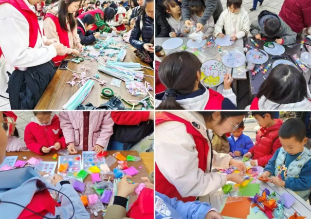 画扇子区,小朋友们专注地在素白团扇上涂抹色彩,用画笔蘸取斑斓的色彩,在扇面上勾勒出天马行空的想象;折纸台前,队员们一步步演示,孩子们认真模仿,灵巧的手指翻飞之间,彩纸化作栩栩如生的千纸鹤、活灵活现的小青蛙、含苞待放的花朵;扭扭棒更是因其可塑性强而备受青睐,不一会儿,美丽的花束、俏皮的发箍、精致的小戒指等纷纷诞生,戴在头上、挂在胸前,成就感满满。现场欢声笑语不断,家长们在旁协助、拍照,记录下这温馨的瞬间。此外,戳戳绣和黏土制作也吸引了不少亲子家庭参与,大家在协作中体验手作的乐趣,增进了情感交流。