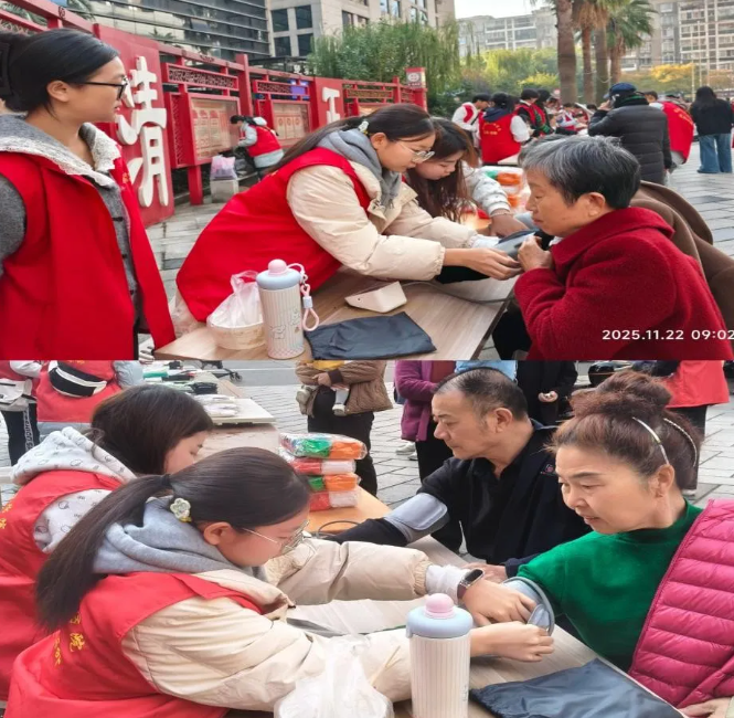 与此同时,另一侧的“健康关爱”服务也暖意涌动。来自生命健康学院相关专业的队员们利用所学知识,搭建起了临时的“健康驿站”。他们耐心为社区长者测量血压,并耐心解答关于高血压防治、日常保健等方面的问题。“阿姨,最近降温了,要注意保暖,饮食清淡一些。”“爷爷,您血压正常,但平时也要多走动。”队员们一边测量,一边轻声叮嘱,将关怀融入每一个细节。一句句温暖的叮嘱,一次次专业的服务,让老人们连连称赞。