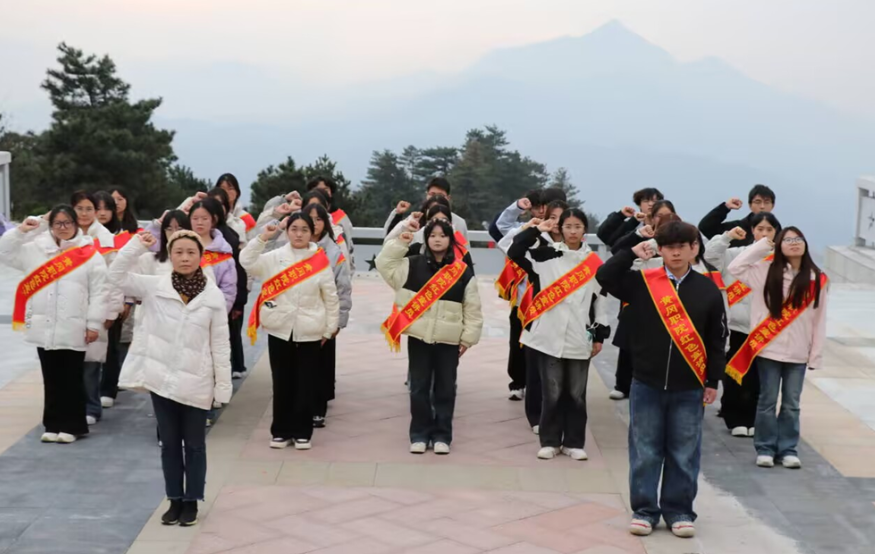 活动中,宣讲团成员先后参观了红二十五军军部旧址和长征集结革命历史陈列馆。一幅幅泛黄的照片、一件件斑驳的实物,无声诉说着那段烽火连天的岁月。在鄂豫皖省委常委扩大会议旧址前,大家齐声高唱《三大纪律八项注意》,激昂旋律回荡山间,仿佛穿越时空与先辈共鸣。随后,全体成员重走“红军步道”,徒步攀登至牛背脊战斗纪念碑。在庄严肃穆的氛围中,全体红色宣讲员举起右拳庄严宣誓:“铭记革命历史,传承红色基因,争做堪当民族复兴重任的时代新人!”