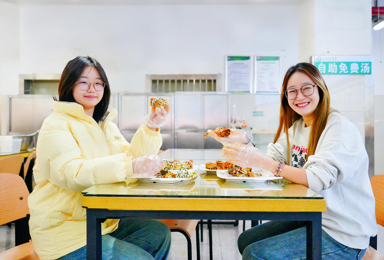 “两种口味都试了,真得超值!”学校新闻专业2023级学生涂圆和同学围坐一桌,一边熟练地拆蟹,一边兴奋地分享道,“大螃蟹肉质肥美,掰开后蟹肉和蟹膏满满当当,我喜欢吃香辣的,一口下去椒麻鲜香,蟹膏如凝脂一样在嘴里化开,幸福感爆棚。”