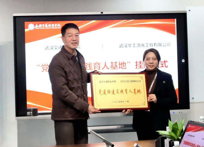 活动尾声,双方共同举行“育人基地”挂牌仪式。这标志着武汉交通职业学院与华工激光工程有限责任公司在产教融合、协同育人方面建立了更为紧密的联系,为未来双方在人才培养、实习实训、技术研发等方面的深度合作搭建了坚实的平台,实现了党建引领下校企资源的有效对接与优势互补。