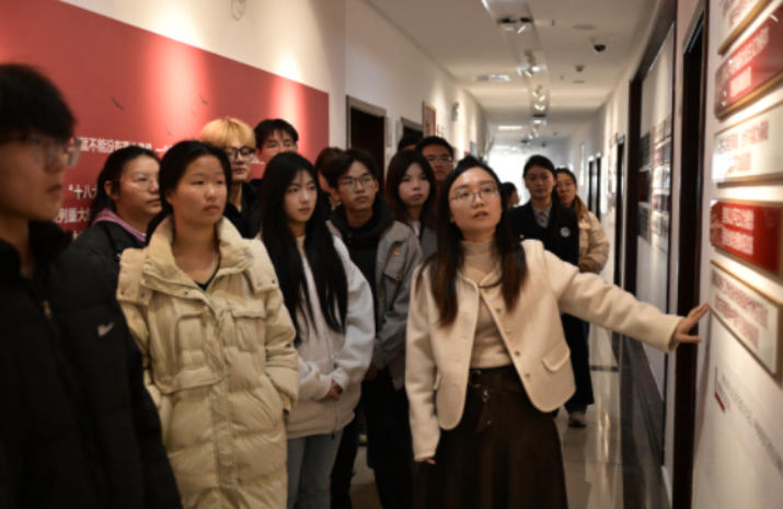 师生在学校“思想之光”文化长廊开启“追光之旅”,长廊以习近平强军思想、习近平经济思想、习近平生态文明思想、习近平外交思想、习近平法治思想和习近平文化思想“六大思想”为主题,通过9面主题墙串联起党的十八大以来理论创新的发展脉络,是马克思主义学院打造的一个沉浸式学习贯彻习近平新时代中国特色社会主义思想的场域。师生重点研学了习近平强军思想的核心要义,为外出实践筑牢思想根基。