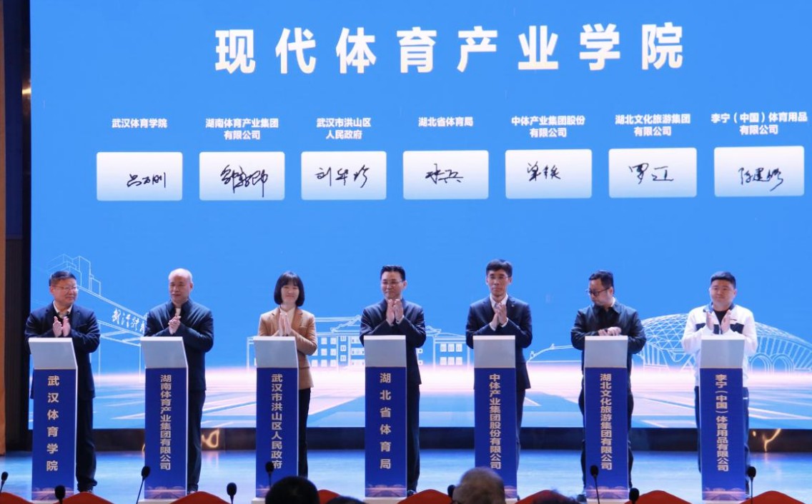 11月30日,武汉体育学院与湖北省体育局、武汉市洪山区人民政府、中体产业集团股份有限公司、湖北文化旅游集团有限公司、湖南体育产业集团有限公司、李宁(中国)体育用品有限公司六家单位签署共建“现代体育产业学院”合作框架协议,标志着湖北省首个省级现代体育产业学院建设迈出关键一步。