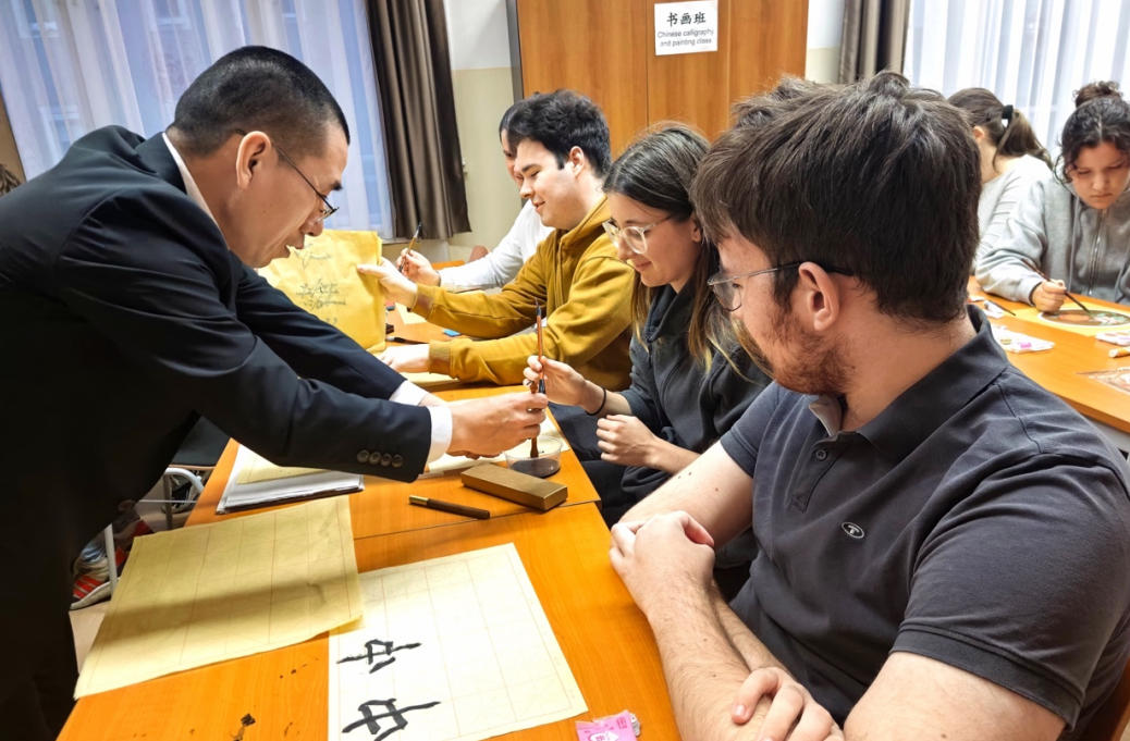 孔子学院教室里,清雅的茶香在温杯、置茶、冲泡间缓缓弥漫,与醇厚的墨香氤氲交织。“横要平,竖要直,捺如刀!”长职考察团成员手执狼毫,在宣纸上向匈牙利学生们演示中国毛笔字的书法精髓,将横竖撇捺化作流动的韵律。孔子学院学生马丁屏息临摹,宣纸上的“长江”二字虽显稚嫩,却满溢着跨文化学习的欣喜。“原来中国毛笔能写出如此丰富的线条,中国字的每一笔都有心跳!”当他举起作品时,周围响起快门声与赞叹声。这场即兴书法教学,让传统笔墨化作连接东西方心灵的密码。