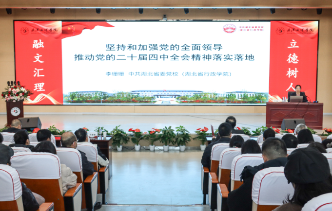 武汉文理学院党委于12月3日在5号楼报告厅举办学习贯彻党的二十届四中全会精神宣讲报告会。湖北省委宣讲团成员、省委党校马克思主义学院院长李珊珊教授应邀作宣讲报告,校党委书记杜永成主持报告会并讲话。