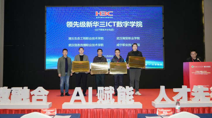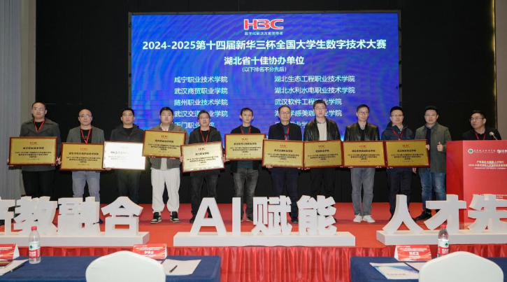 在授牌颁奖环节,学院凭借与新华三技术有限公司等头部企业的深度合作,以及在“新华三杯”大赛组织与协办方面的突出贡献,获颁“领先级新华三ICT数字学院”称号,并荣膺“2024-2025年第十四届‘新华三杯’全国大学生数字技术大赛湖北省十佳协办单位”。两项荣誉的取得,既是对学院长期以来推动教育链、人才链与产业链有机衔接的高度肯定,彰显了学院在推动产教融合、深化AI时代人才培养方面的卓越成效,更标志着学院在构建高水平数智人才培养体系的征程上迈出坚实步伐。