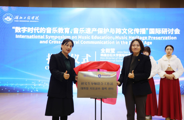 韩国白石大学国际交流处副处长全叙莹(JeonSeo-young)、湖北工程学院国际合作与交流处处长冯倩代表各学校共同为研究生导师联合工作站揭牌。